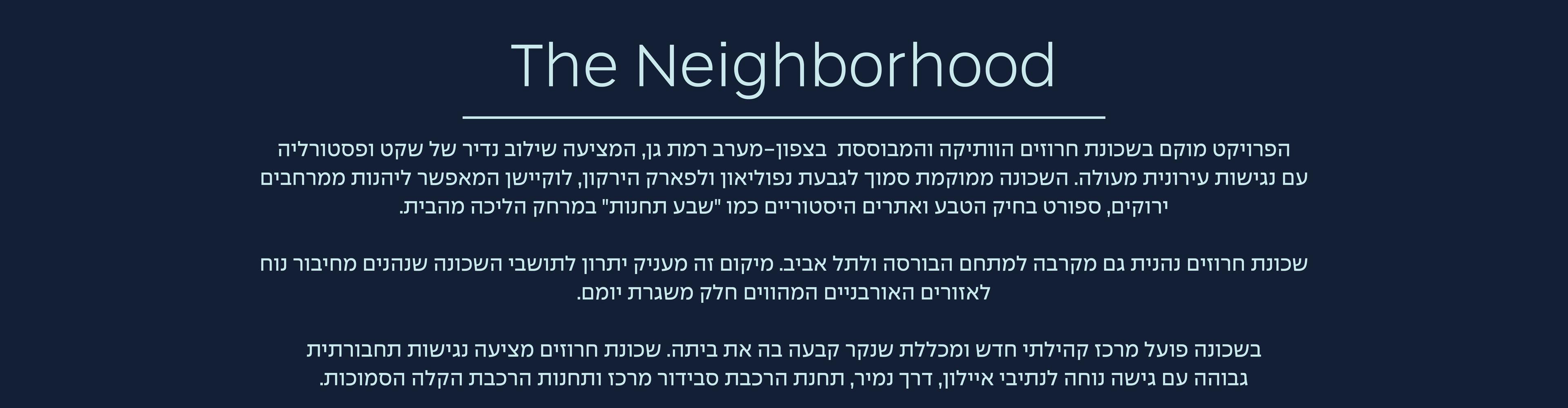 בשכונת חרוזים האיכותית, מקימה חברת אשטרום מגורים פרויקט בוטיק יוקרתי שמאפשר ליהנות מכל העולמות: גם אורבניות וגם קרבה לפארק הירקון, גם רמת גן וגם תל אביב, גם איכות וגם סטייל, גם פינתי וגם מרכזי, גם הנאה בבית וגם בילוי בחוץ, גם שכונה ותיקה ומבוססת וגם דירה חדשה.